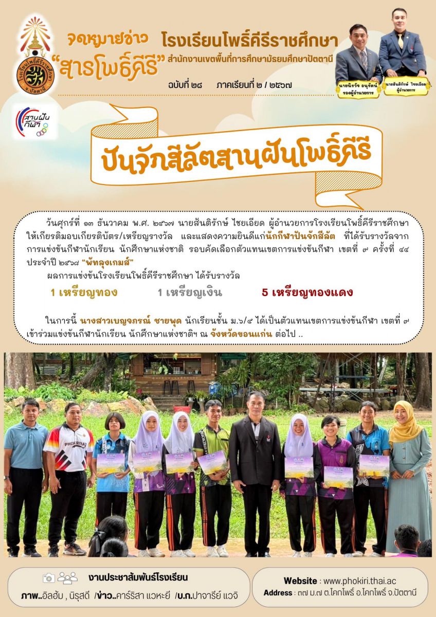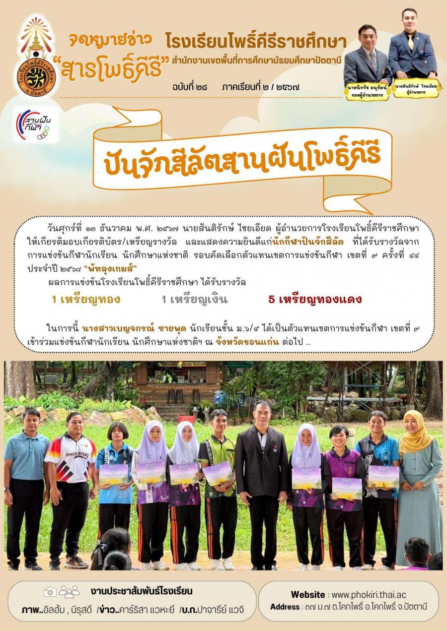 นายสันติรักษ์ ไชยเอียด ผู้อำนวยการโรงเรียนโพธิ์คีรีราชศึกษา ให้เกียรติมอบเกียรติบัตร/เหรียญรางวัล และแสดงความยินดีแก่นักกีฬาปันจักสีลัต ที่ได้รับรางวัลจากการแข่งขันกีฬานักเรียน นักศึกษาแห่งชาติ รอบคัดเลือกตัวแทนเขตการแข่งขันกีฬา เขตที่ ๙ ครั้งที่ ๔๔ ประจำปี ๒๕๖๘ “พัทลุงเกมส์”