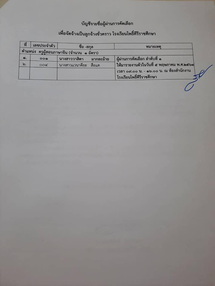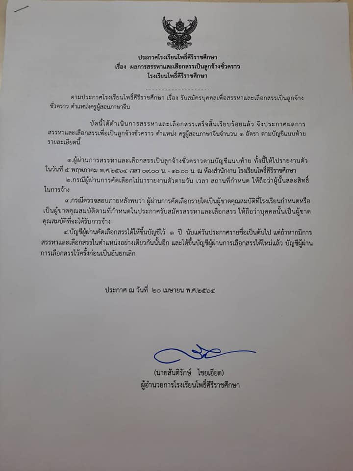 ประกาศ... ????ผลการสรรหาและเลือกสรรเป็นลูกจ้างชั่วคราว ตำแหน่งครูผู้สอนภาษาจีน โรงเรียนโพธิ์คีรีราชศึกษา