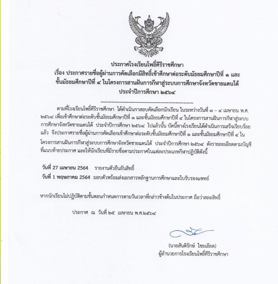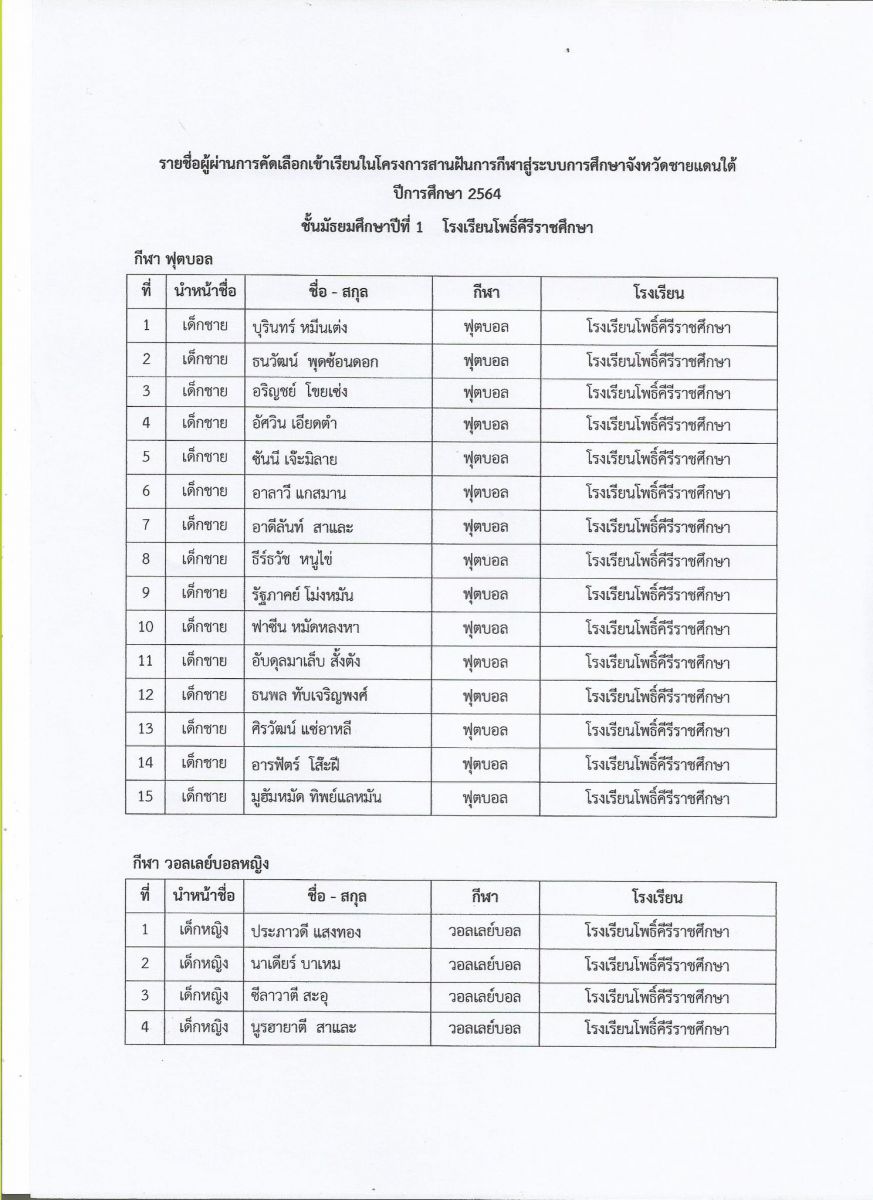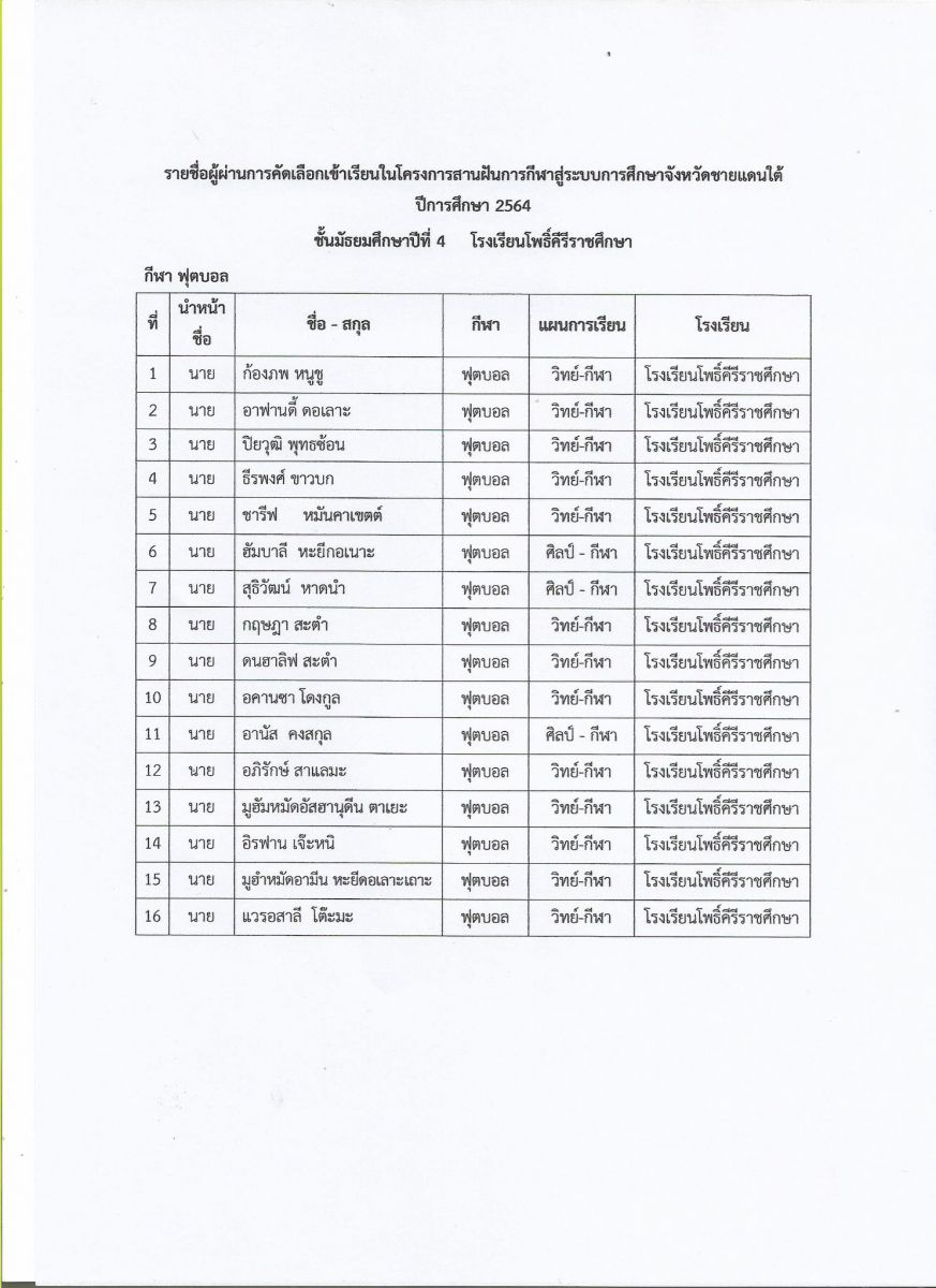 ประกาศผลการคัดเลือกนักเรียน ม.1และ ม.4 โครงการสานฝันการกีฬาสู่จังหวัดชายแดนใต้
