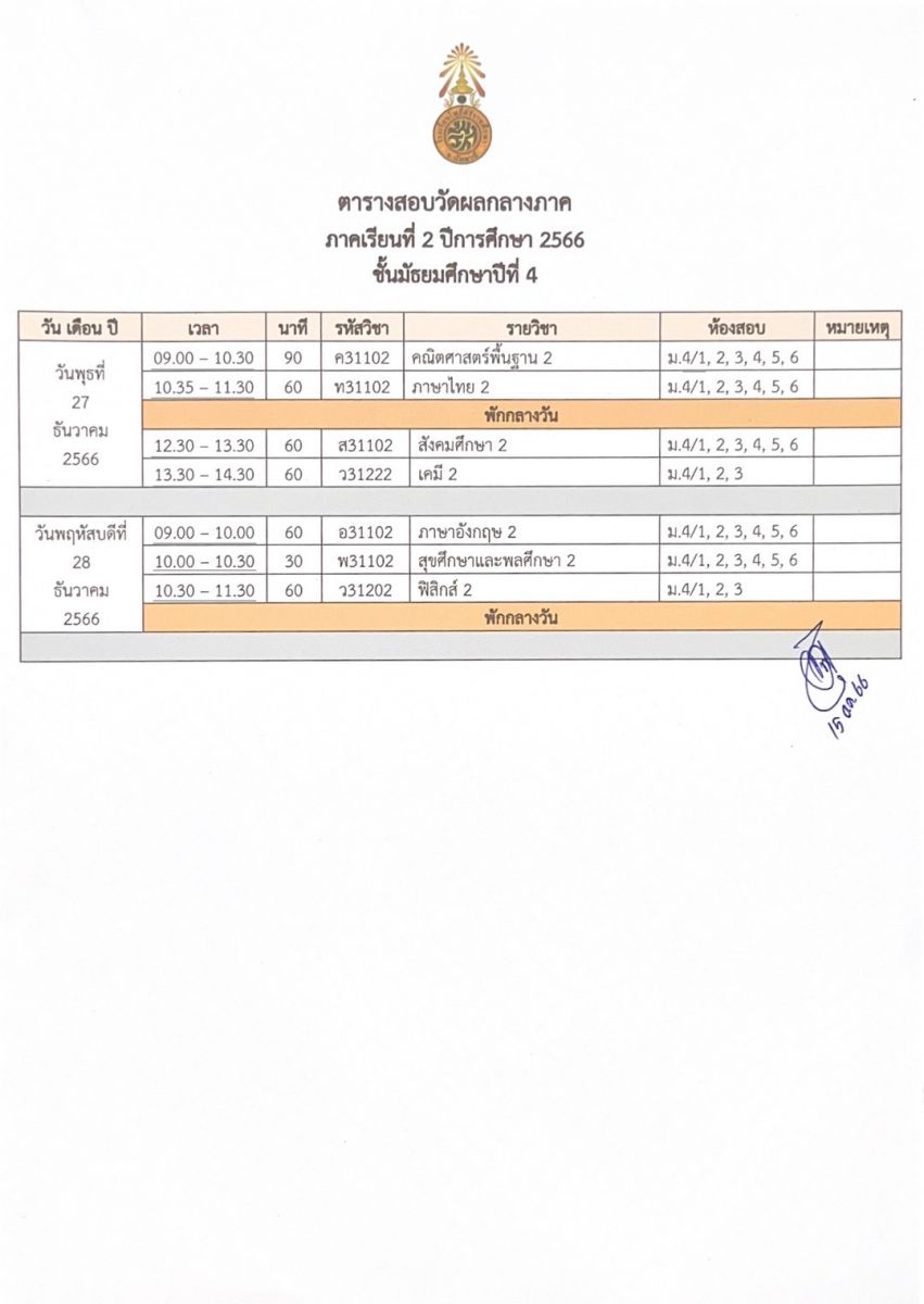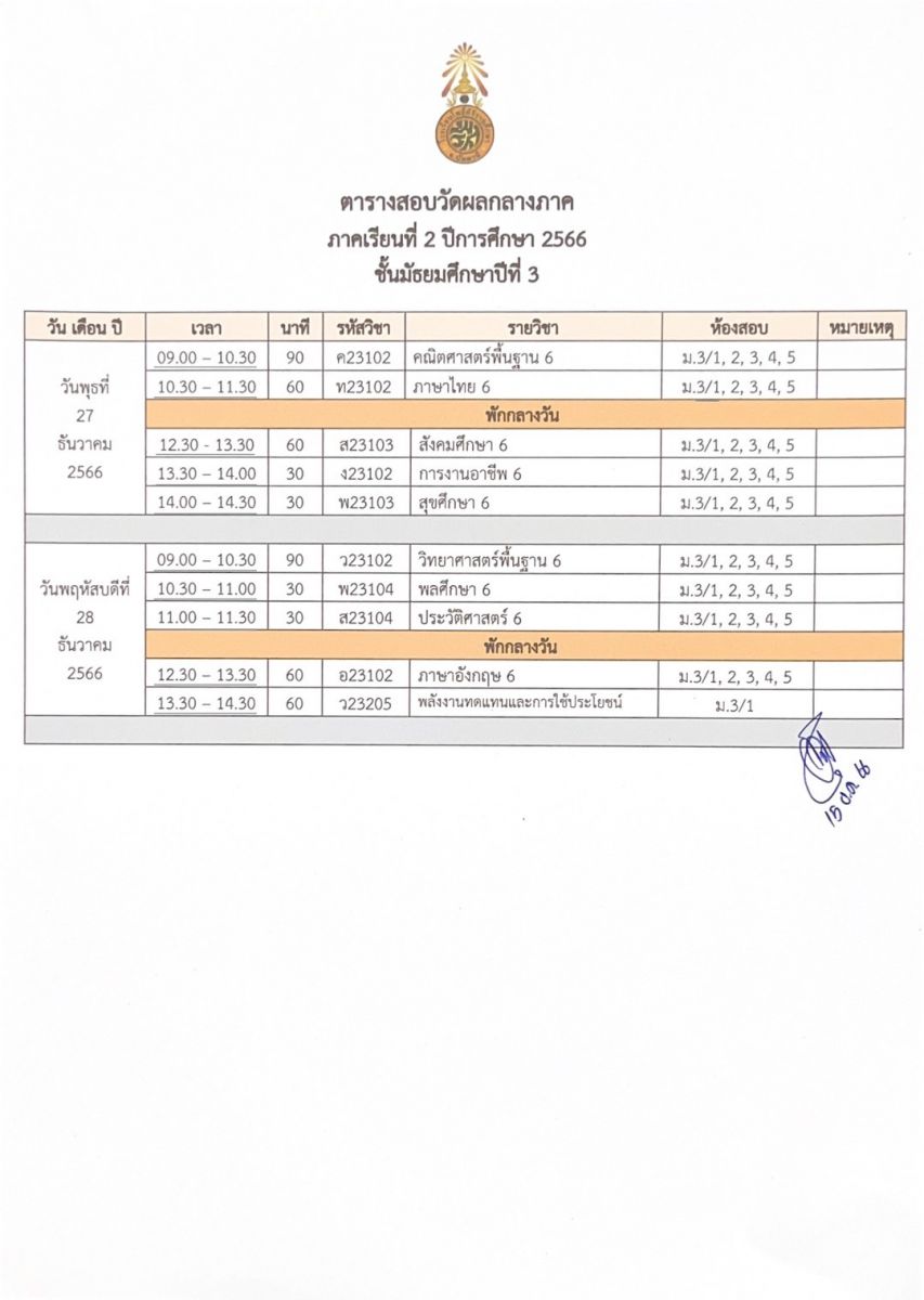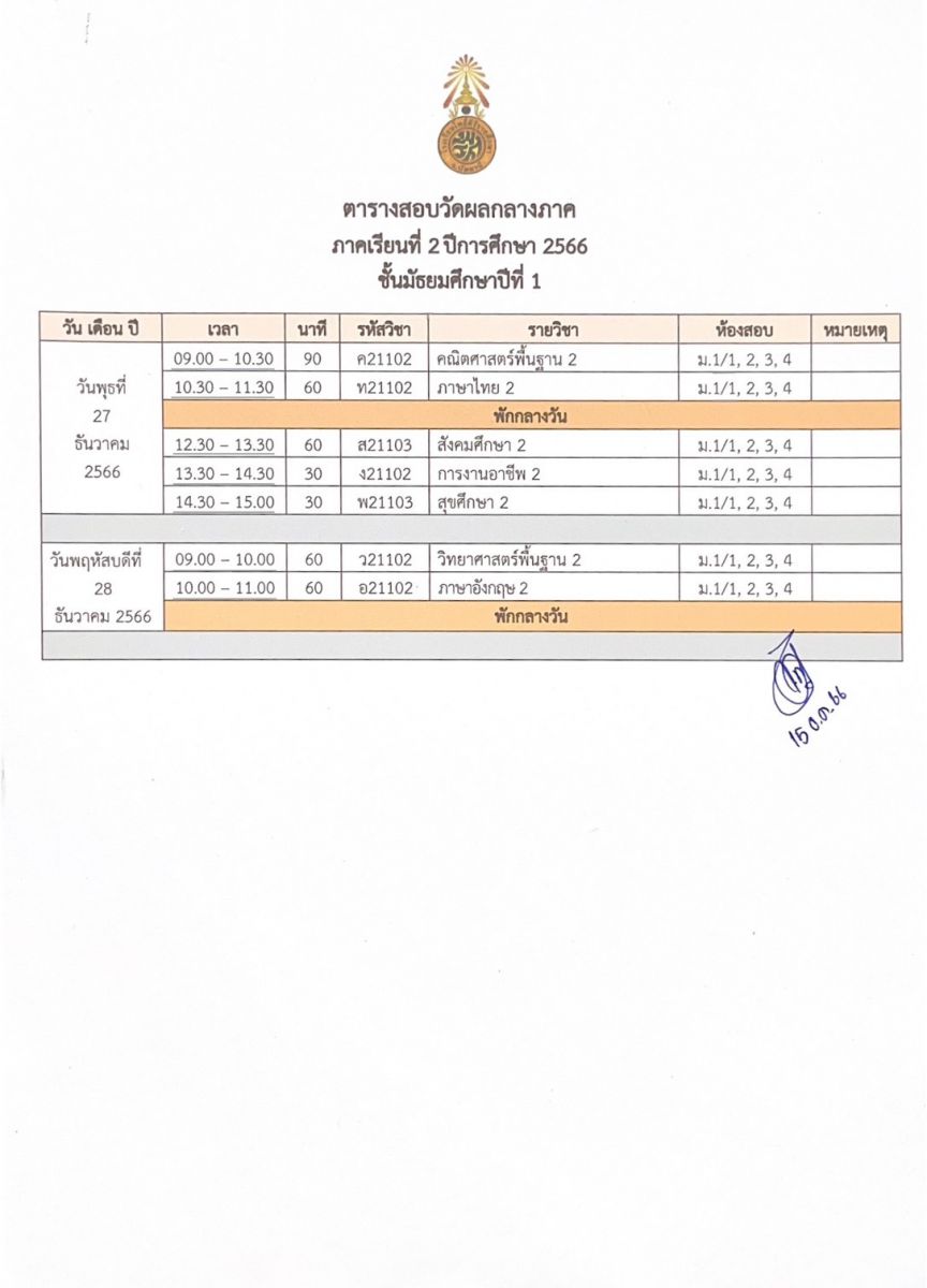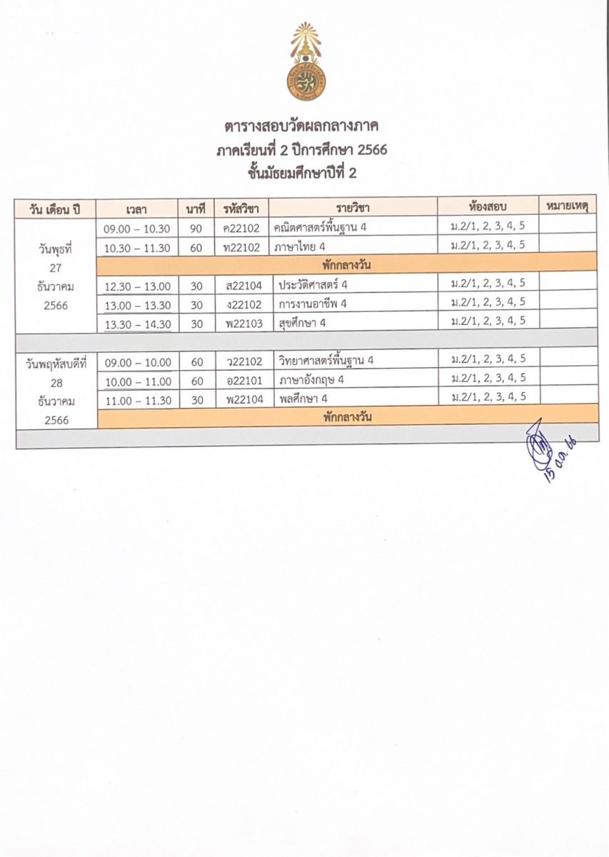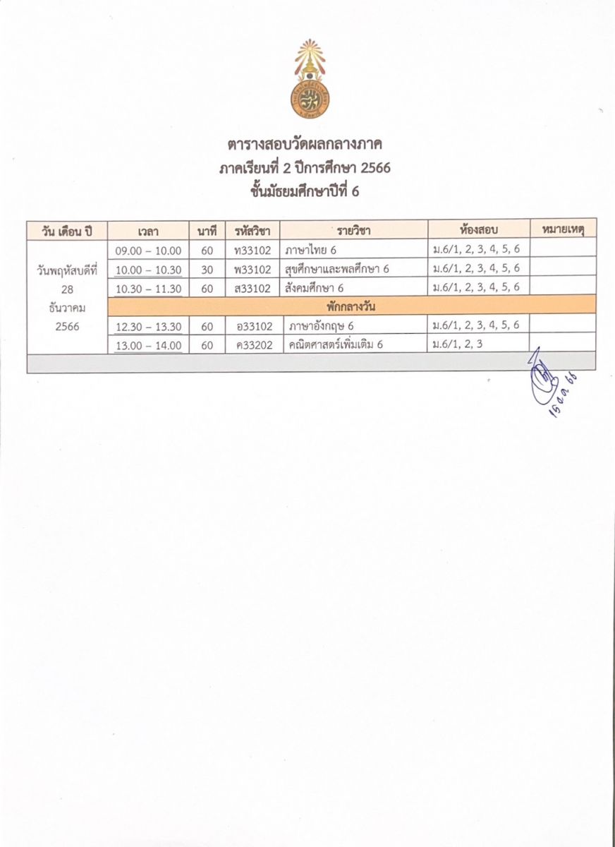 ตารางสอบวัดผลกลางภาค ปีการศึกษา 2566 ภาคเรียนที่ 2