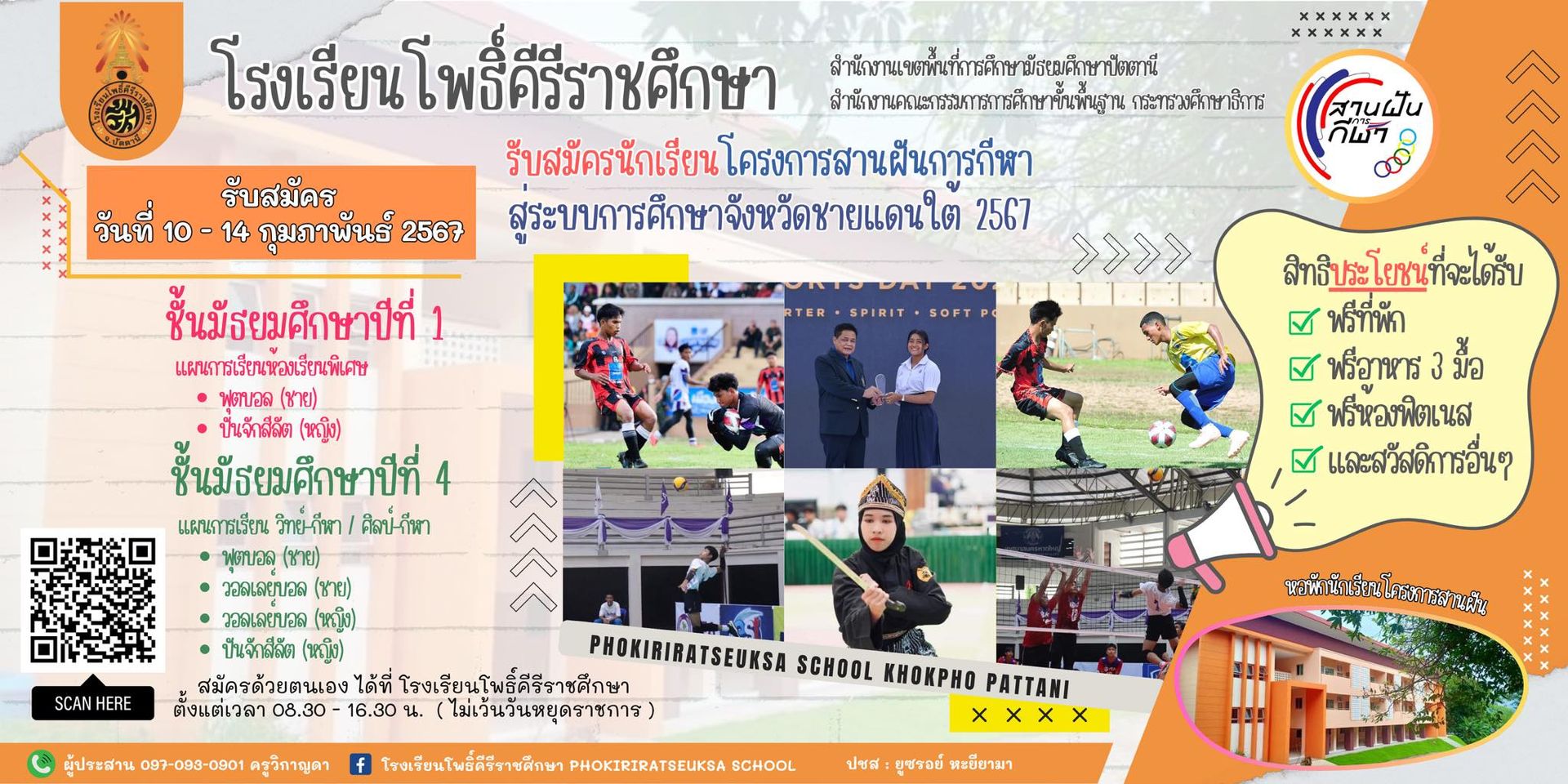 ประกาศโรงเรียนโพธิ์คีรีราชศึกษา เรื่อง การรับสมัครนักเรียนเข้าศึกษาต่อระดับชั้นมัธยมศึกษาปีที่ 1 และชั้นมัธยมศึกษาปีที่ 4 ในโครงการสานฝันการกีฬาสู่ระบบการศึกษาจังหวัดชายแดนใต้ ประจำปีการศึกษา 2567????