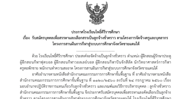 ประกาศโรงเรียนโพธิ์คีรีราชศึกษา เรื่องรับสมัครบุคคลเพื่อสรรหา และเลือกสรรเป็นลูกจ้างชั่วคราว ตามโครงการจัดจ้างครูและบุคลากร โครงการสานฝันการกีฬาสู่ระบบการศึกษาจังหวัดชายแดนใต้