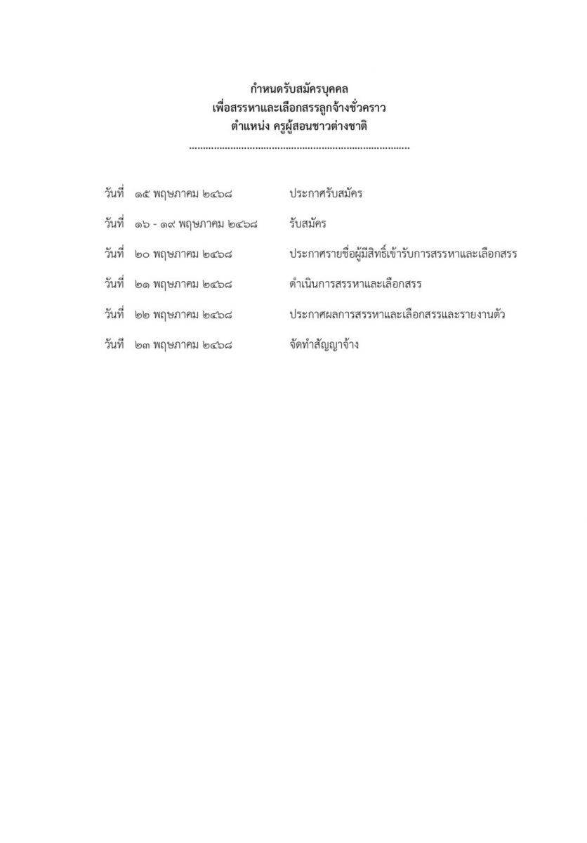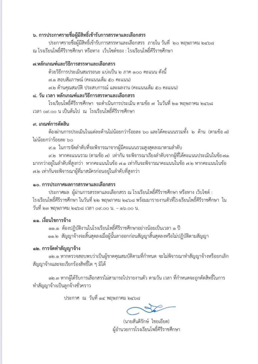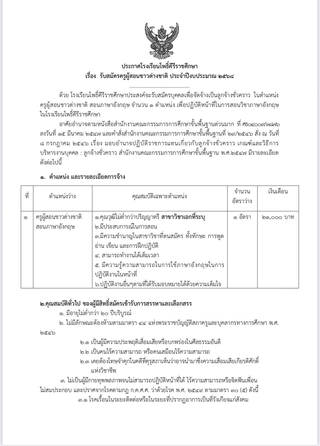 ประกาศ : โรงเรียนโพธิ์คีรีราชศึกษา เรื่องรับสมัครครูผู้สอนชาวต่างชาติ ประจำปีงบประมาณ ๒๕๖๘